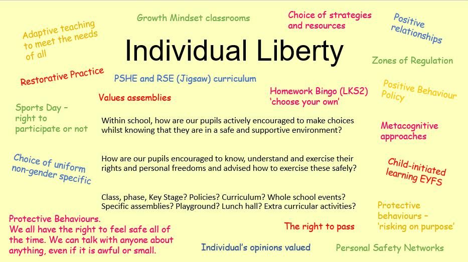 Within school, children are actively encouraged to make choices, knowing that they are in a safe and supportive environment. As a school we educate and provide boundaries for all children to make choices safely, through provision of a safe environment and an empowering approach through the education. Children are encouraged to know, understand and exercise their rights and personal freedoms and are advised how to exercise these safely, for example through our E-Safety and PSHE/RSE lessons. Children are further empowered through being part of a School Council and being able to take part in pupil forums which report back to SLT with issues and fund raising ideas. Children are given the freedom to make a wide range of choices from attending extra-curricular clubs to supporting fund raising events.