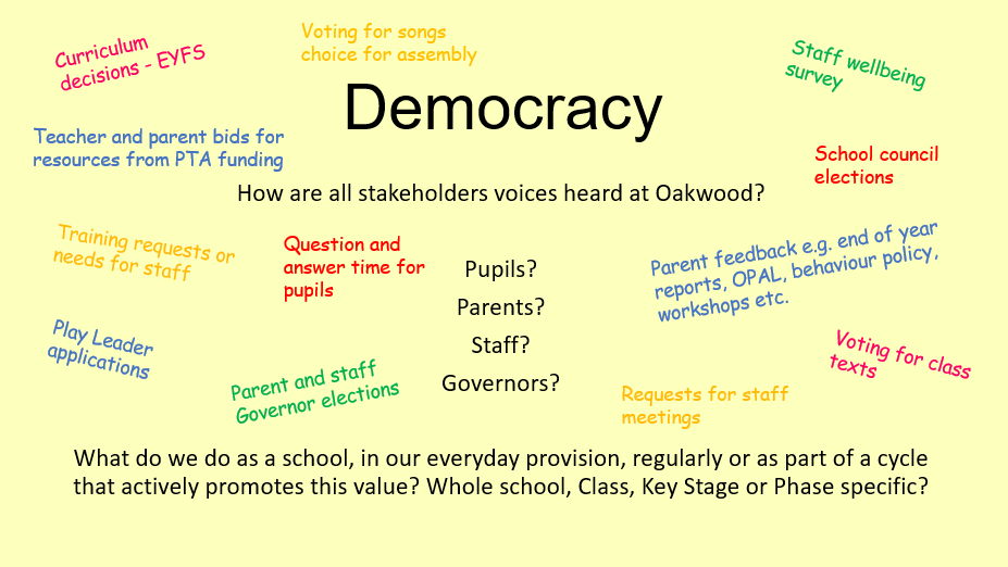Children, parents and staff have many opportunities for their voices to be heard at Oakwood Primary School. Democracy is central to how we operate. Children and staff alongside our Governors have had input into developing our school values of: