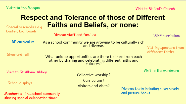 Members of different faiths or religions are encouraged to share their knowledge to enhance learning within classes and the school. We also encourage visits from representatives of different faiths to the school and visits to places of worship to promote positive relationships across different communities.